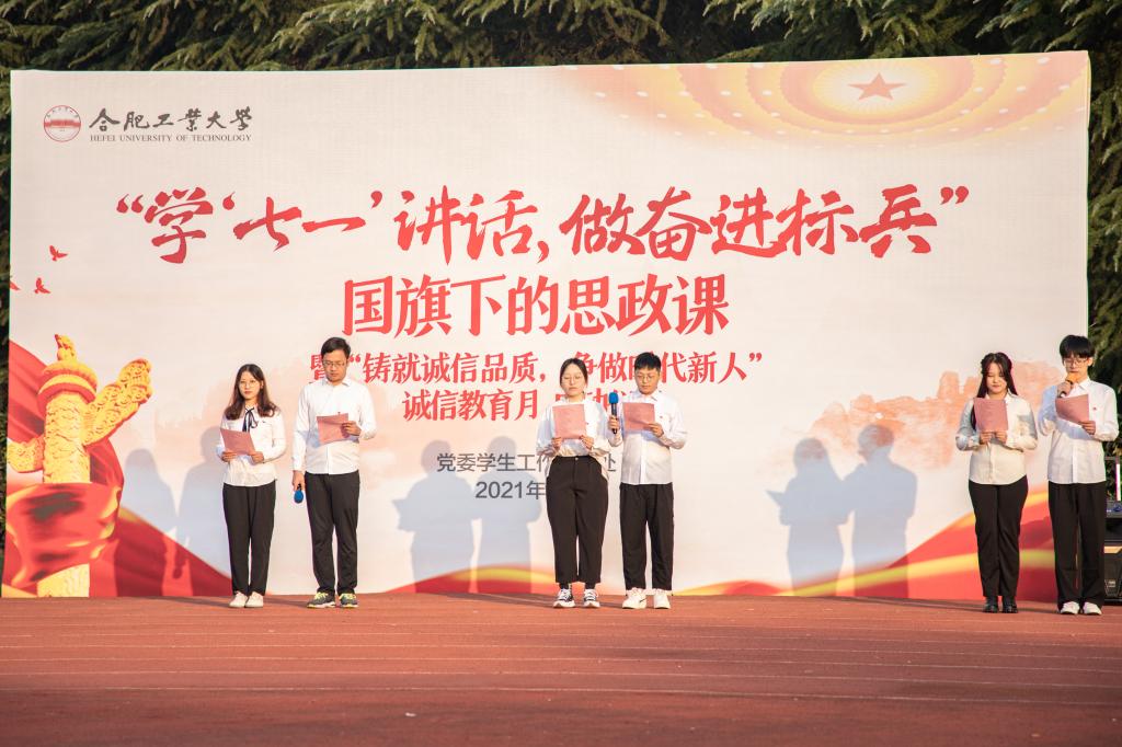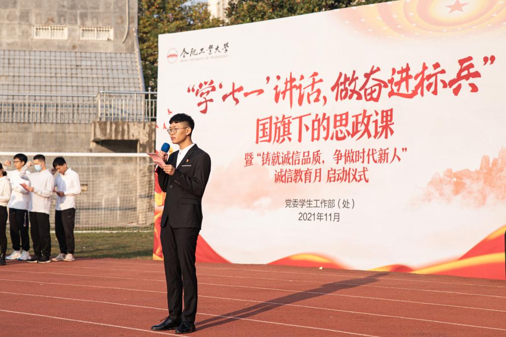 随后,学院2020-21学年国家奖学金获得者材料成19-2班王国强同学做国旗下的思政课《学习习近平总书记“七一”重要讲话精神,传承红色基因做新时代工大有为青年》主题演讲,王国强同学以习近平总书记在七一讲话中深情寄语新时代的中国青年以“实现中华民族伟大复兴为己任,增强做中国人的志气、骨气、底气,不负时代,不负韶华,不负党和人民的殷切期望”为主题,呼吁全体学子学习专业知识和党史,增强专业本领,努力做社会主义合格建设者和可靠接班人。王国强领誓全体同学“铸就诚信品质,争做时代新人”致新葡的京集团350vip8888官网全体学生承诺书,在场学生跟读,势如长虹。