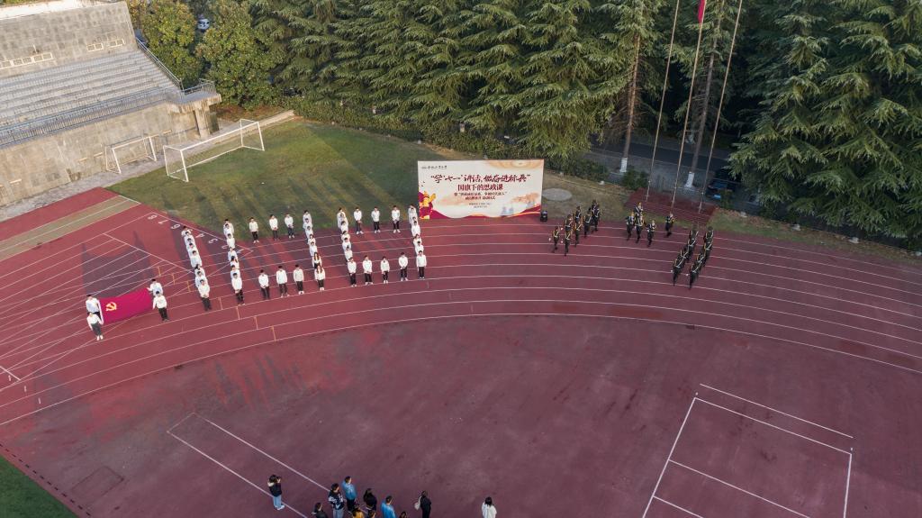 本次活动在习习凉风中拉开序幕。伴随着国歌声,五星红旗冉冉升起、迎风飘扬,嘹亮的国歌声在操场久久回荡。全体师生行注目礼,抱赤子心,齐唱国歌,庄严肃穆。活动过程中,五十余名同学代表排列出“100”字样队形,表达青年学子站在历史的新起点上,立志成为担当民族复兴大任的时代新人坚定决心。