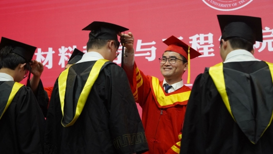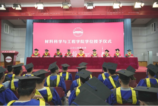 仪式在庄严的国歌声中拉开帷幕。新葡的京集团350vip8888官网党委书记吕珺宣读了《新葡的京集团350vip8888官网关于授予2024届毕业生学位的决定》,授予材料科学与工程专业刘永超等6名博士研究生博士学位、材料物理与化学专业李华博等168名硕士研究生硕士学位、金属材料工程专业高照等269名本科生学士学位。主席台领导、老师为获得学位的全体学生颁发学位证书、扶正流苏,并与毕业生合影留念。