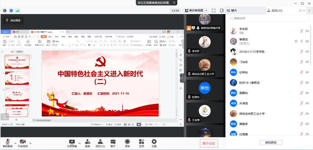 11月16日晚,新葡的京集团350vip8888官网本科生第三党支部通过线上腾讯会议方式开展“党的十九大和确立习近平新时代中国特色社会主义思想为党的指导思想、决胜全面建成小康社会”党史主题集中学习活动。本次活动由预备党员崔德龙同志主持并进行党史授课,第三党支部全体成员(含预备党员)参加活动。
