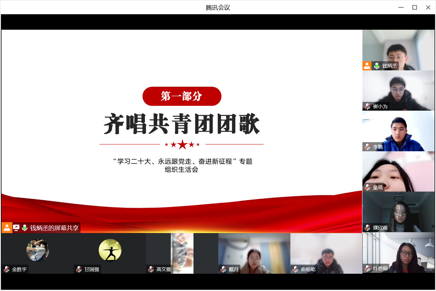 会议中,团员齐唱共青团团歌。团支部书记汇报了团支部本年度关于“学习二十大、永远跟党走、奋进新征程”主题教育实践活动的开展情况,并结合团支部工作和个人实际情况交流心得体会。随后,结合个人学习体会,团支部委员、其他团员依次发言分析个人在思想道德和学习工作中的不足及努力方向,表示将在接下来的大学生活中脚踏实地学好专业知识,提高工作水平,时刻保持学习工作中的积极性,奋发进取,奉献青春力量。根据全体团员日常表现及发言表态,团支部线上开展民主测评投票,由班主任针对本次组织生活会展开点评,提出发展建议。最后,在团支部书记的带领下,全体与会团员重温入团誓词,回顾入团初心。