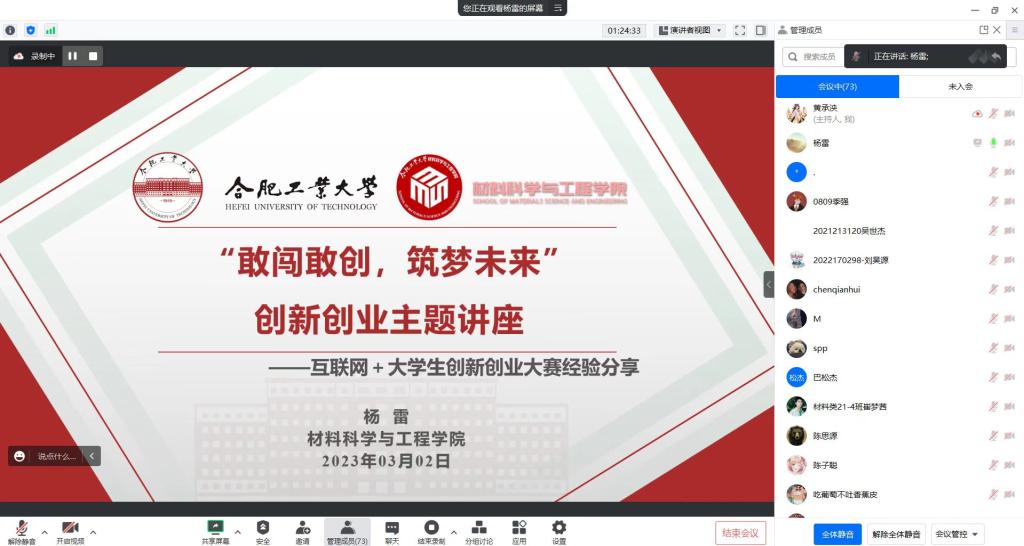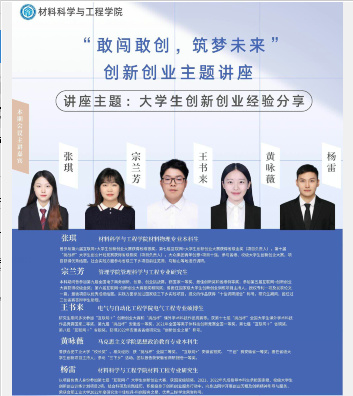 3月3日,新葡的京集团350vip8888官网线上成功举办“敢闯敢创,筑梦未来”创新创业主题讲座。本次讲座,共邀请了5名具有丰富创新创业赛事参赛经验的同学担任主讲,同时这5位同学均在不同的赛事中获得了出色的成绩。