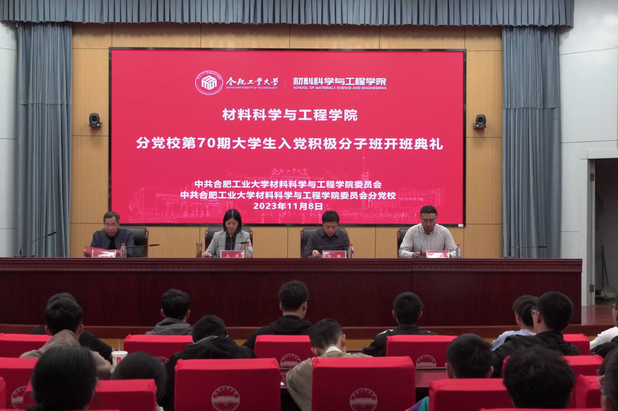 11月8日晚,新葡的京集团350vip8888官网分党校第70期大学生入党积极分子培训班开班仪式暨党课第一讲在屯溪路校区学术会议中心一楼报告厅顺利举行。学院党委、分党校相关负责人、班主任及123名学员在会场参加了仪式。
