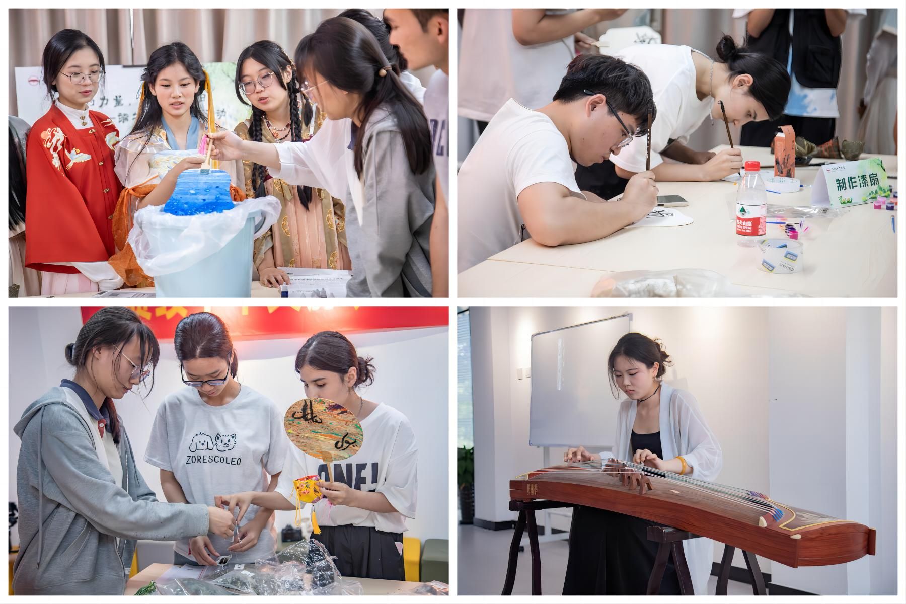 随即,在汉服社同学们的演示与解说下,大家共同学习制作漆扇、装包香囊、编制彩绳等端午节传统习俗。同学们以漆作笔,以水为画,选择自己喜欢的款式绘就而成,像一副流动的国画。端午节佩戴香囊象征着驱邪避灾、祈福祈愿的传承,大家装填香料,制作特别功能的香囊现,场气氛十分活跃。