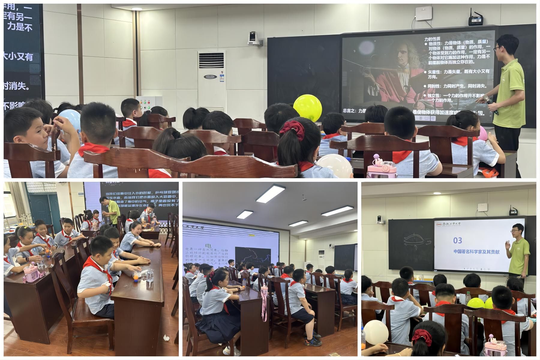 科普宣讲活动开始之前,同学们对于支教团的到来表示了热烈欢迎,现场洋溢着浓厚的求知氛围。宣讲活动中,支教团的成员们,以历史长河为引,讲述了科学从萌芽到壮大的非凡旅程,激发了孩子们对科学探索的浓厚兴趣。随后,支教团的成员们为同学们展示了一系列精心设计的科普小实验,如“会跳远的乒乓球”展现了力学之美,“滴水不漏”揭示了流体力学的奥秘,“旋转飞行器”则让孩子们亲身体验了空气动力学的魅力,每一个实验都让孩子们惊叹不已,亲手触摸到了科学的神奇与魅力。之后在科普知识问答环节中,孩子们纷纷举手抢答,思维的火花在思维间碰撞。