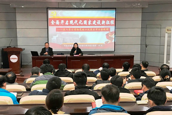 为进一步增强教职工的政治定力,切实将思想和行动统一到党的十九届五中全会精神上来,12月10日下午,新葡的京集团350vip8888官网在斛兵报告厅举行十九届五中全会精神学习专题报告会。中共安徽省委党校决策咨询部主任、省委党校党的建设与国家治理研究院执行院长张彪教授应邀作了题为“全面开启现代化国家建设新的征程——深入学习党的十九届五中全会精神”专题宣讲。全院教职工、部分学生党员干部参加学习。