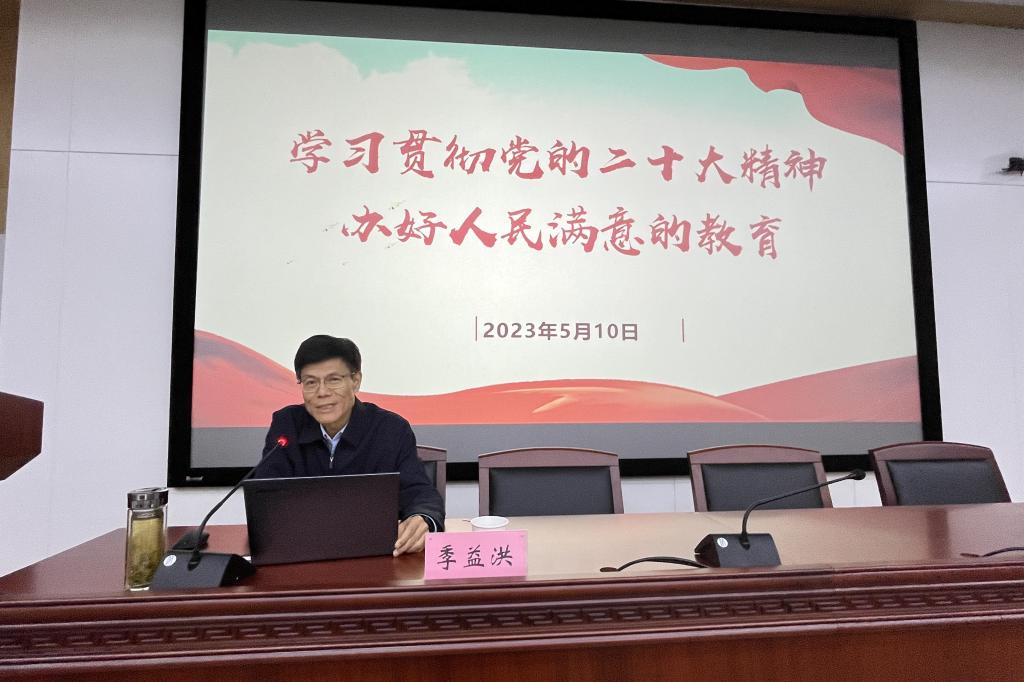 为深入学习贯彻党的二十大精神,扎实开展学习贯彻习近平新时代中国特色社会主义思想主题教育,5月10日下午,校党委常委、副校长季益洪以《学习贯彻党的二十大精神,办好人民满意的教育》为主题为新葡的京集团350vip8888官网、数学学院师生党员讲授专题党课。